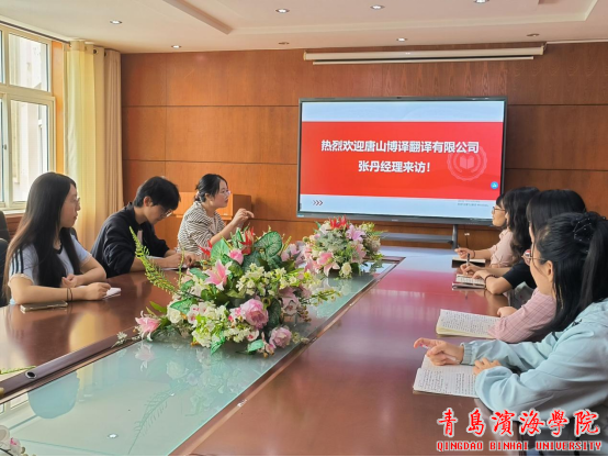 2025年9月26日上午,翻译专业邀请唐山博译翻译有限公司张丹经理在地球村会议室交流语言服务行业的市场需求。国际语言文化实践教学中心刘菁老师陪同接待。翻译专业骨干教师和2023级学生代表参会。