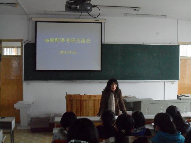 为增强同学们的考研意识,鼓励他们树立远大目标,2011年4月6日东语学院举行08级学生考研动员大会。东语学院院长蒋凤英,朝鲜语专业学科带头人崔羲秀教授,朝鲜语专业教研室主任,各个本科班班主任以及07考研学生代表李蒙、陈秋亚参加了此次会议。