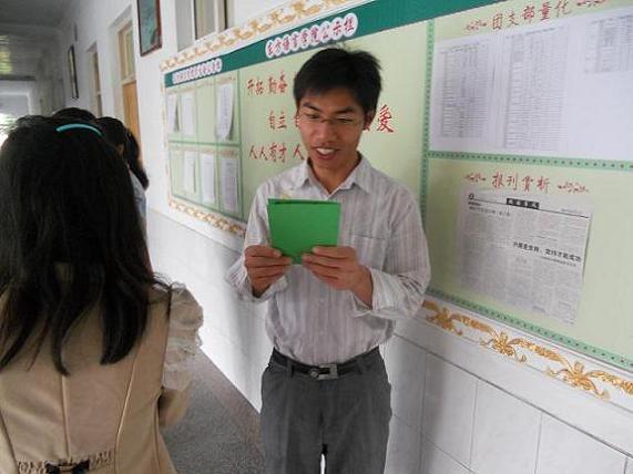 早上7:30分,学生会和团总支的同学们准时在大厅列队站好,等待各位老师的到来。同学们将亲手制作出的造型各异的贺卡、精美的小装饰物送给老师们,这些卡片虽然不如摆在商店里的那些,但是它们凝聚的是同学们对老师的深深情意,这是中华民族传统美德的重要体现。收到同学们送出的贺卡,老师们的脸上都挂上了开心的笑容,特别是当老师们知道这是同学们亲手制作的手工贺卡时,更是对这些卡片爱不释手。