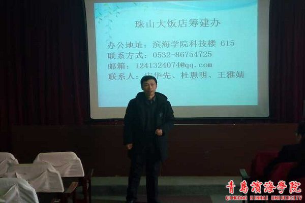 我校为了给应届毕业生提供更多更合适的岗位,使优秀的人才尽早发挥自身的价值,外国语学院于2017年3月3日下午2点10分在第一报告厅,召开了“青岛西海岸珠山大饭店”的宣讲会。珠山大饭店人力资源部负责人宋华先部长、杜恩明老师以及外国语学院唐在锦老师出席了本次会议。